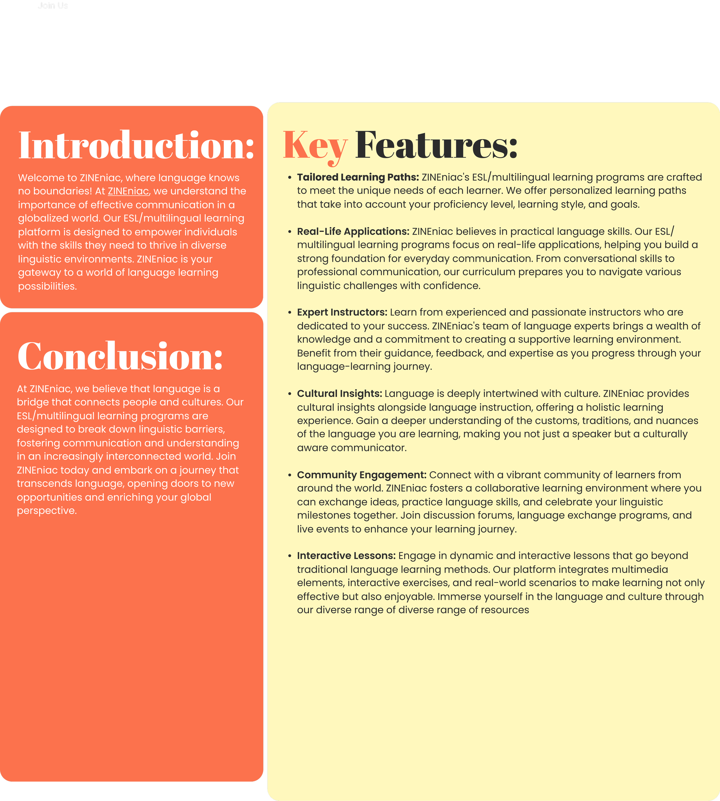 ESL/MULTILNGUAL Learning At ZINEniac, we go beyond traditional learning methods to offer a comprehensive language support curriculum for English as a New Language learners. Our dedicated Creative Instructors use engaging and interactive methods to bridge the gap between school and at home by providing support in the student’s home language until they become English proficient. To improve on English language proficiency, our enrichment programs are designed to make learning enjoyable and effective by using resources that are linguistically and age / grade appropriate. We believe in fostering a supportive environment where individuals can enhance their language skills, boosting confidence in their communication and academic endeavors. Join us on a language-learning journey that not only addresses educational needs but also creates a foundation for lifelong linguistic success.